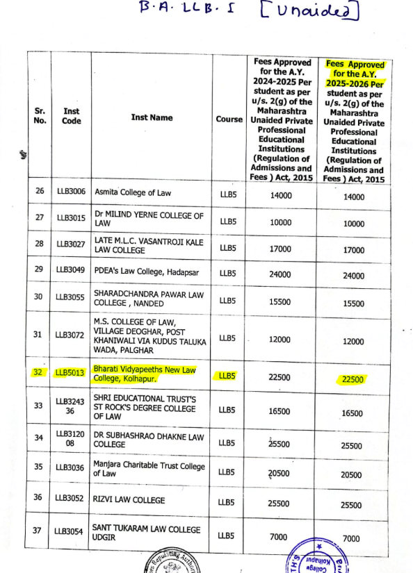 30 Aug, 2025 Bharati Vidyapeeth New Law College Kolhapur has released the Fee Structure for AY 2025-26. The fee for BA + L.L.B is ₹ 22,500 /Yr.