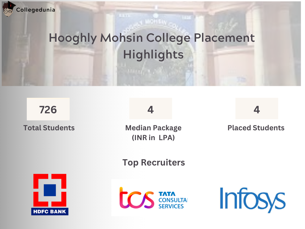 Hooghly Mohsin College placement report for 2025 has not yet been released. In 2024, the median package offered was INR 4 LPA. Out of 726 students, 4 students were placed. Some of the placement recruiters are IBM, Infosys, and TCS and many more.