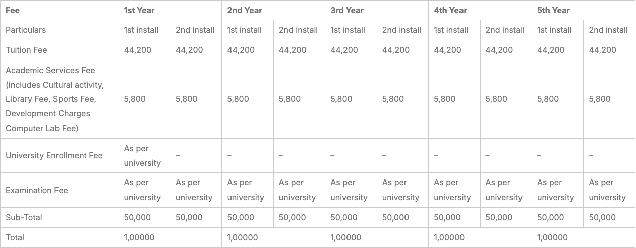 The first-year fee is 94,000, with potential scholarships available for domicile, CLAT, and others that may last throughout the course. From the second year on, the annual fee reduces to 77,000. More details can be found on the college's official website.