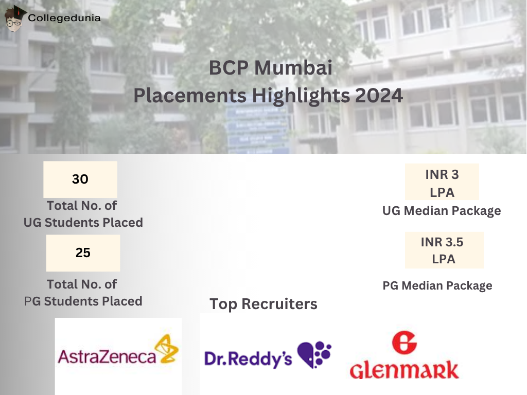 Bombay College of Pharmacy has a well-equipped Placement Cell that actively connects students with various corporate organizations, particularly in the pharmaceutical sector. The college facilitates placements for approximately 80-90% of students annually, with companies like Ranbaxy, Mankind, Neurokind, Cipla, Novartis, and Dr. Reddy's visiting for recruitment. The average placement package is reported to be around 3 lakhs per annum, with some packages exceeding 1 lakh per month.