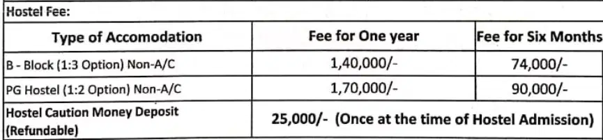 The hostel offers a variety of room sharing options, including single, double, and triple occupancy rooms, with both AC and non-AC options available. The annual fees range from Rs 50,000 for a four-share non-AC room to Rs 1.5 lakh, depending on room type and amenities. Washrooms are attached and cleaned every 2-3 days, while rooms are also regularly cleaned. The hostel provides geysers, washing machines, and lift facilities. Meal quality is generally rated as good, with a menu that changes monthly and includes both vegetarian and non-vegetarian options three times a week.