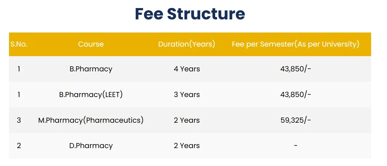 Guru Nanak Institute of Pharmacy Hoshiarpur B Pharma is offered as 4 Years Full Time program. The minimum eligibility criteria for B Pharma is 10+2 with 50%. The total fees for Guru Nanak Institute of Pharmacy Hoshiarpur B Pharma in 2025 is ₹ 3.51 Lakhs for the complete course duration, which includes total tuition fees of ₹ 3.51 Lakhs.