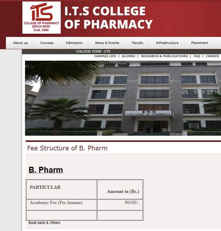 - ITS Pharmacy College Ghaziabad Hostel Fee is ₹ 90,000.