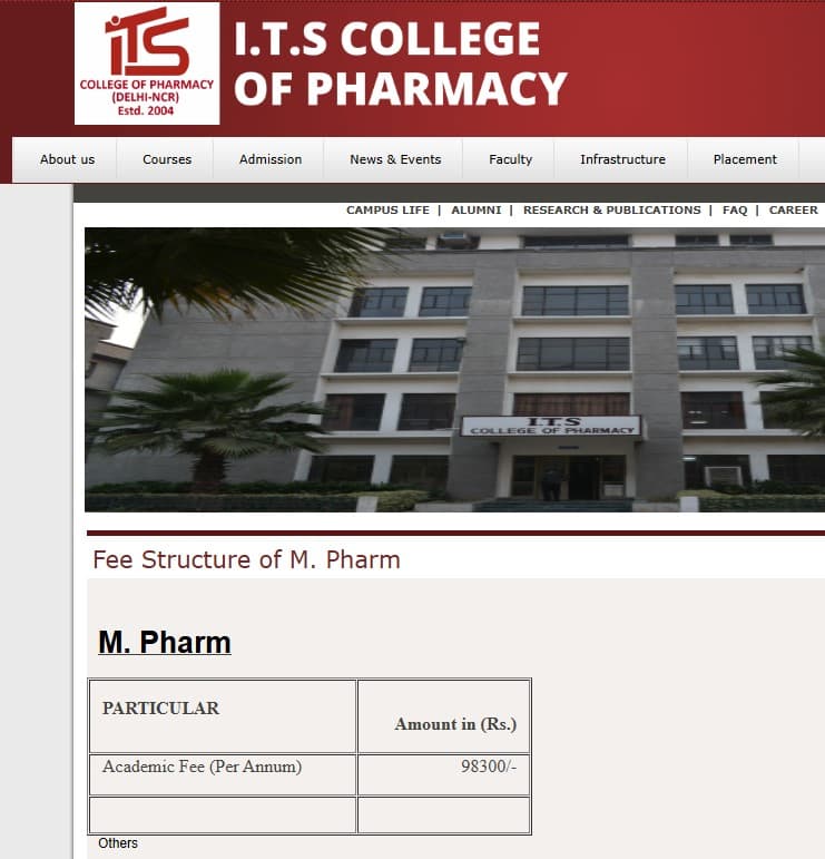 ITS Pharmacy College Ghaziabad M.Pharm Pharmaceutics fees 2025 is ₹ 1.97 Lakhs for the entire course duration.