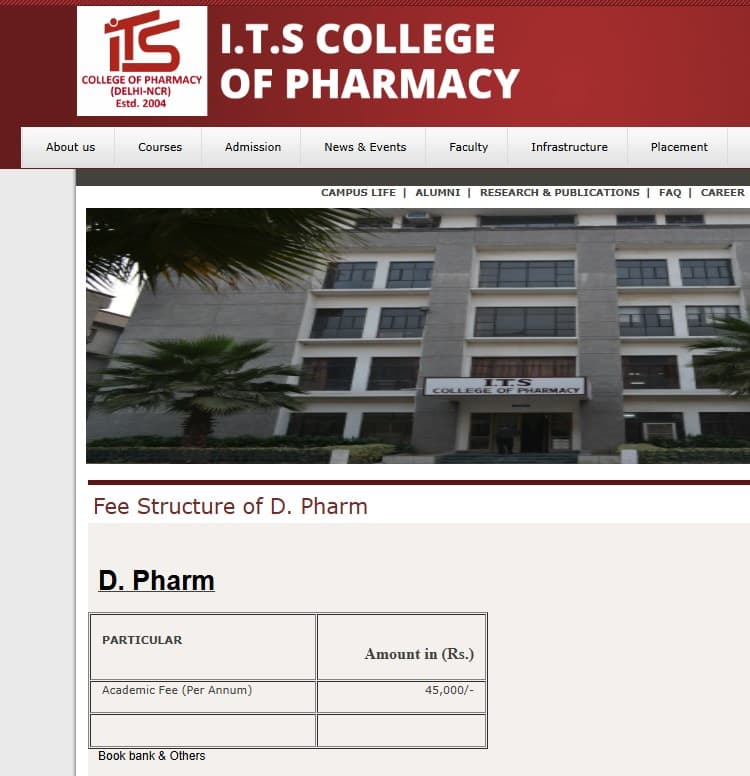 - ITS Pharmacy College Ghaziabad Hostel Fee is ₹ 90,000.