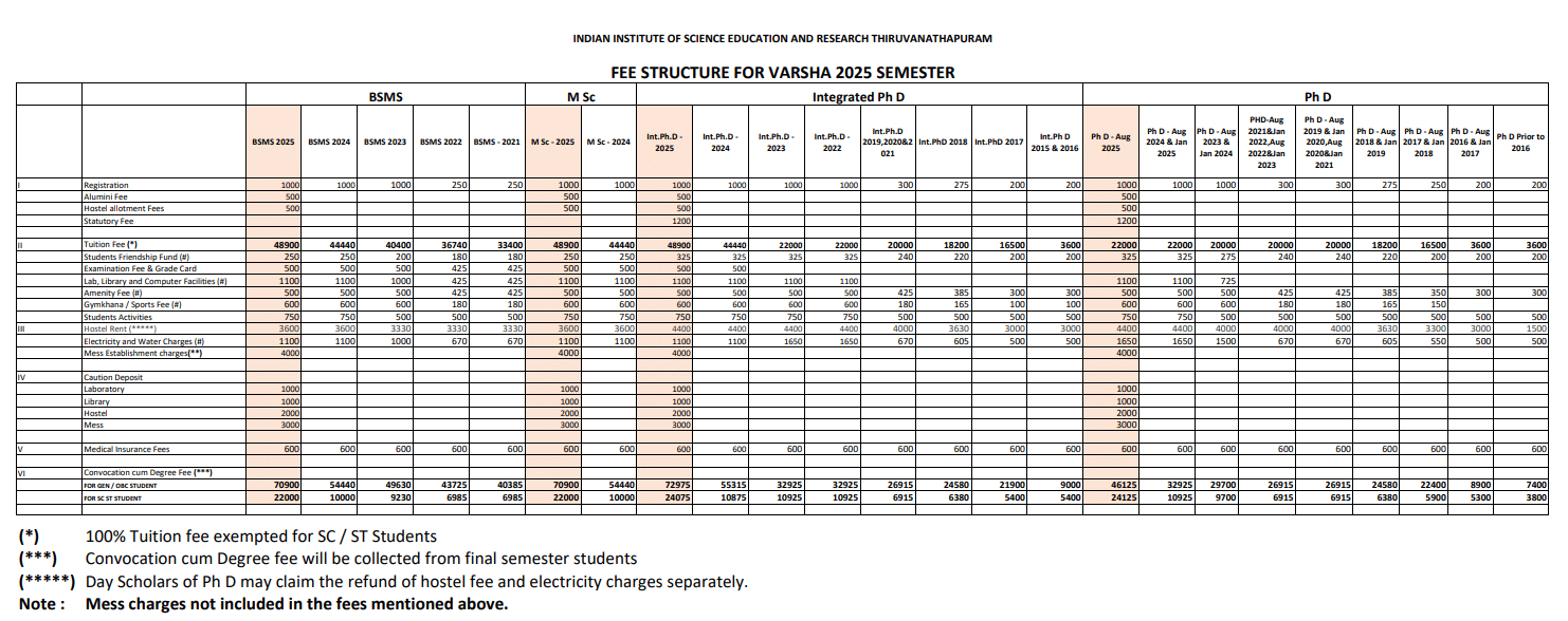 Earlier, BS + MS Biology fees at IISER Thiruvananthapuram was ₹ 5.01 Lakhs (in 2024) for the entire course duration. This shows a fee increase of ₹ 28,960 over the year.