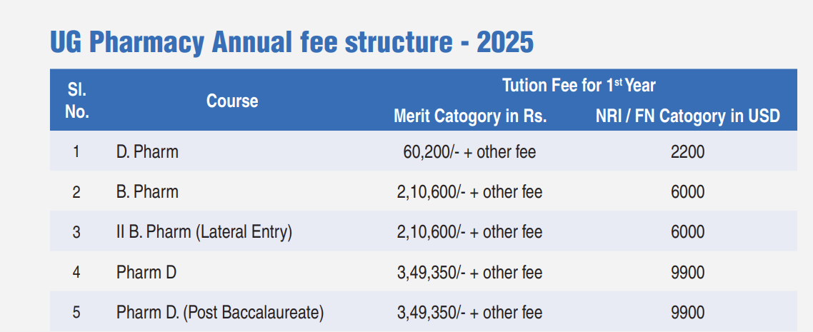 degrees. The institution offers advanced lab facilities and maintains a faculty-student ratio of approximately 4-5 faculty members per 100 students. The current fee structure is Rs 1,57,000 annually for four years, with no additional costs, and payment options include cash, bank transfer, cheque, or card. Scholarships like the Ratan Tata Scholarship are available, with specific criteria such as a minimum CGPA of 8.5 for eligibility. The college has a robust placement program, with nearly 100% placement rates and companies like Life Pharma Dubai and Pfizer participating.