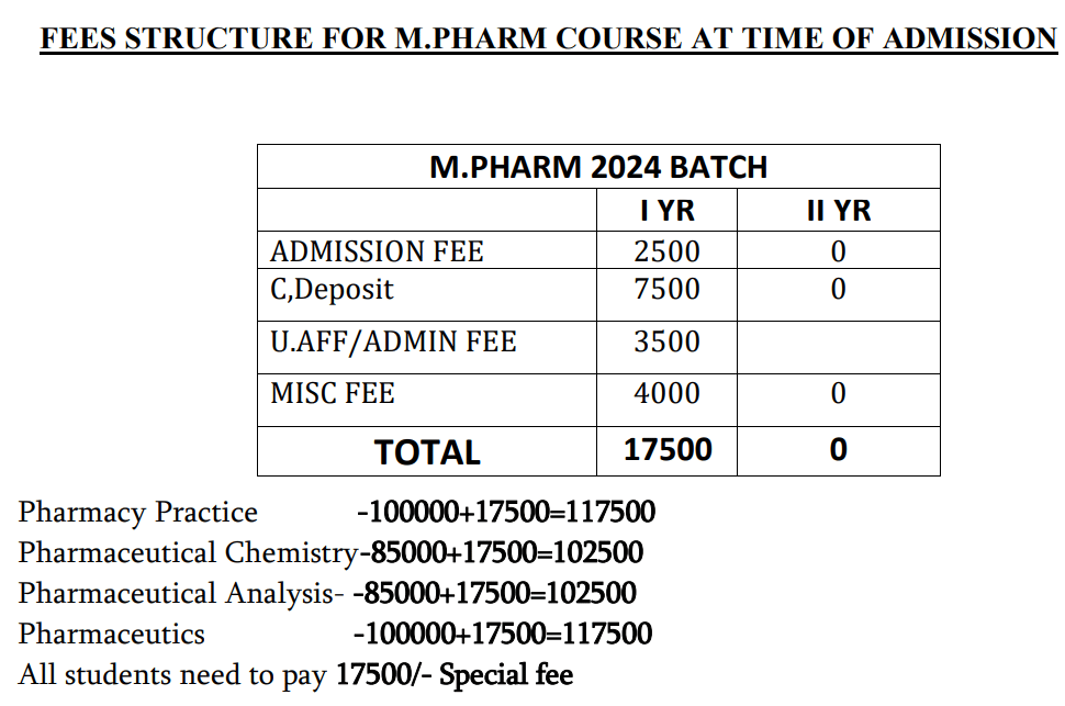 Earlier, M.Pharm Pharmaceutics fees at National College of Pharmacy Kozhikode was ₹ 4.5 Lakhs (in 2022) for the entire course duration. This shows a fee decrease of ₹ 2.15 Lakhs over the year.