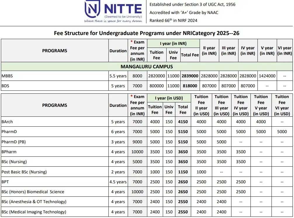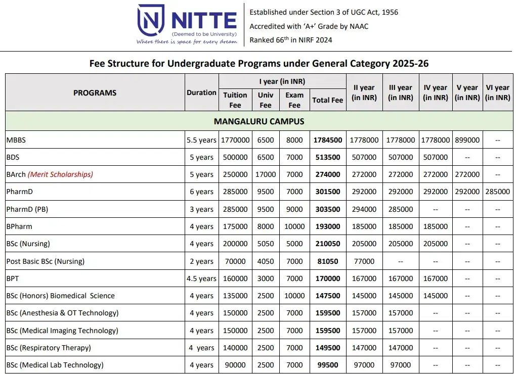 The Nitte Gulabi Shetty Memorial Institute of Pharmaceutical Sciences Mangalore Pharm.D (PB) is offered as 3 Years Full Time program, with total intake of 10 seats. The minimum eligibility criteria for Pharm.D (PB) is BPharm. The total fees for The Nitte Gulabi Shetty Memorial Institute of Pharmaceutical Sciences Mangalore Pharm.D (PB) in 2025 is ₹ 8.83 Lakhs for the complete course duration, which includes total tuition fees of ₹ 8.64 Lakhs. Earlier, the fees in 2023 - 2024 for Pharm.D (PB) was ₹ 8.19 Lakhs.