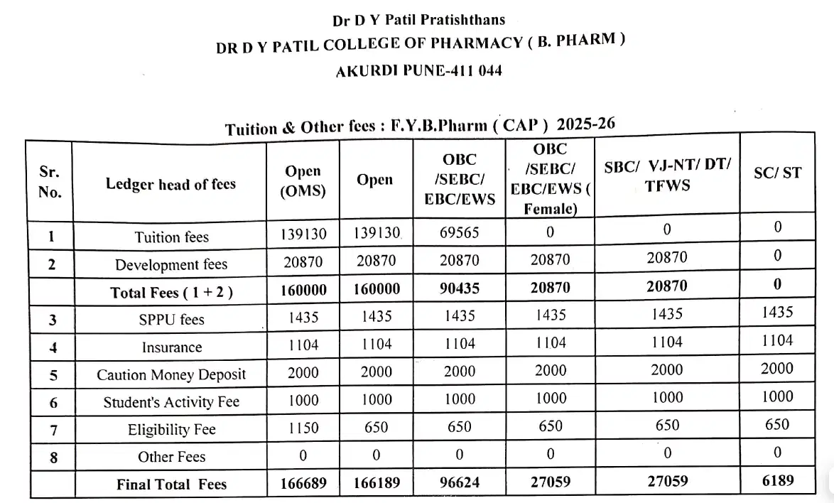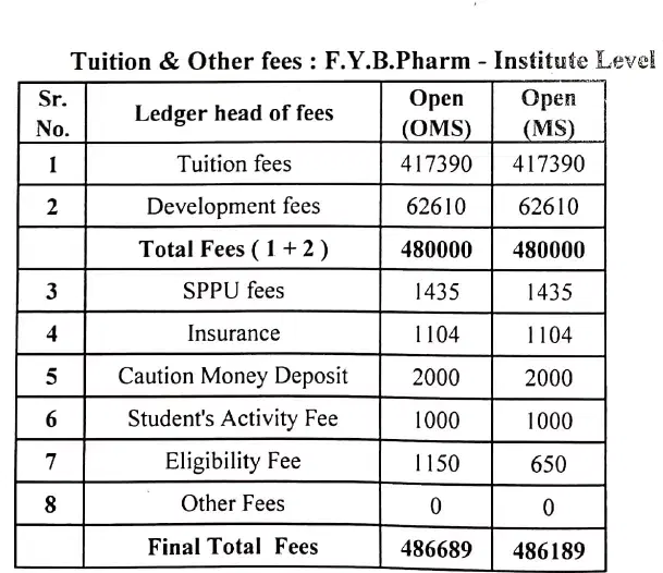 Admission to the college requires the Maharashtra State CET exam and is processed through three CAP rounds, with an extra round available. Students from PCB, PCM, or PCMB groups can apply for the pharmacy course. The college features an experienced faculty, many with PhDs and over 20 years of teaching experience, who follow university guidelines and offer personalized mentorship. The fee structure is affordable compared to other private colleges in Pune, with annual tuition fees at 120,000, but the total annual cost can reach 147,000, excluding additional university fees.