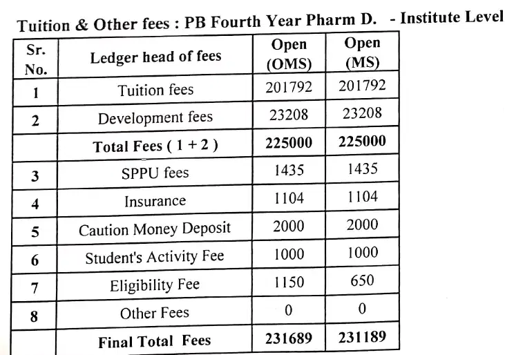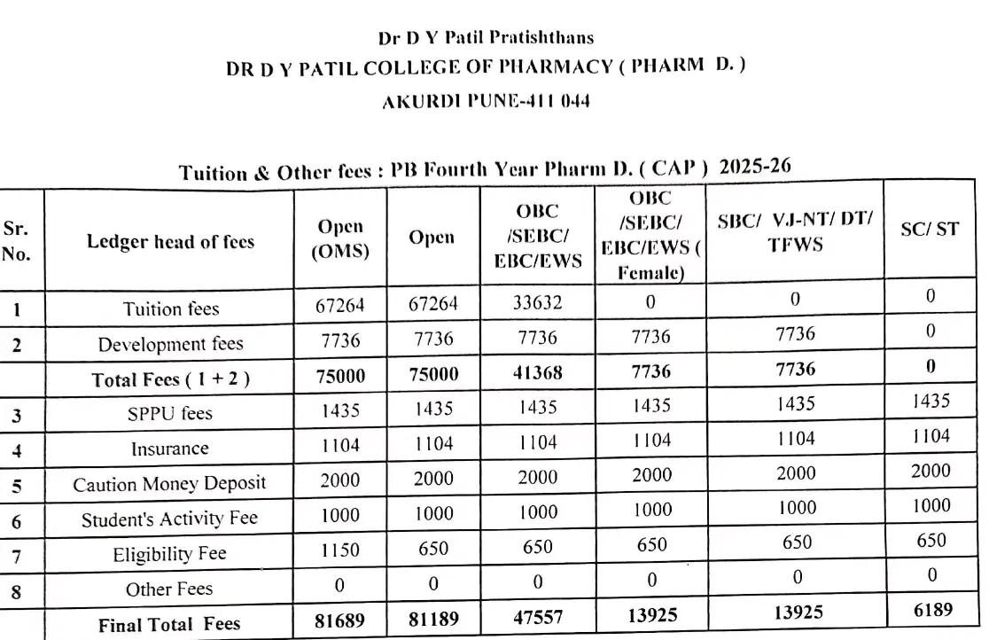 Dr DY Patil College of Pharmacy Akurdi Pune Pharm.D (PB) fees in first year is ₹ 81,689. The detailed fees is mentioned below.