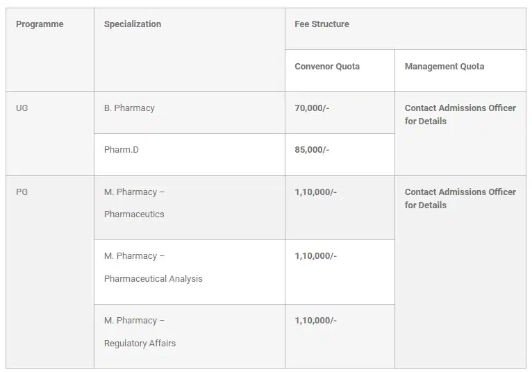 Pulla Reddy Institute of Pharmacy Hyderabad B Pharma is offered as 4 Years Full Time program. The minimum eligibility criteria for B Pharma is 10+2 with 45% + TGEAPCET. The total fees for Pulla Reddy Institute of Pharmacy Hyderabad B Pharma in 2025 is ₹ 2.8 Lakhs for the complete course duration, which includes total tuition fees of ₹ 2.8 Lakhs.