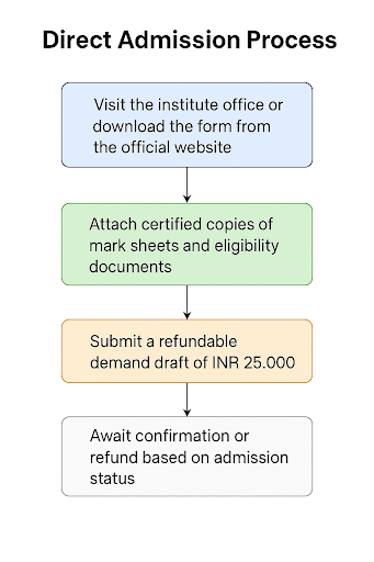 Candidates can apply for direct admission at the institute by submitting the application form along with a refundable demand draft of INR 25,000 and the required documents. This process is applicable for management quota and vacant seats.