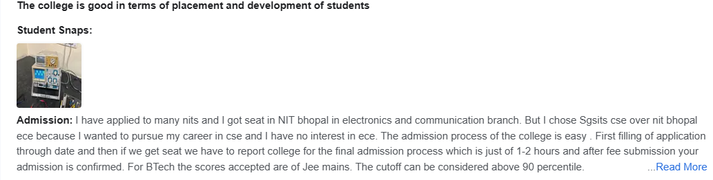 SGSITS Indore offers UG, PG, and Ph.D. programs in the fields of Engineering, Technology, Applied Sciences, Computer Applications, Management, Humanities, Social Sciences, and Pharmacy. Admission to various programs is based on merit in the National Level Examinations like JEE Mains, GATE, GPAT and CMAT.