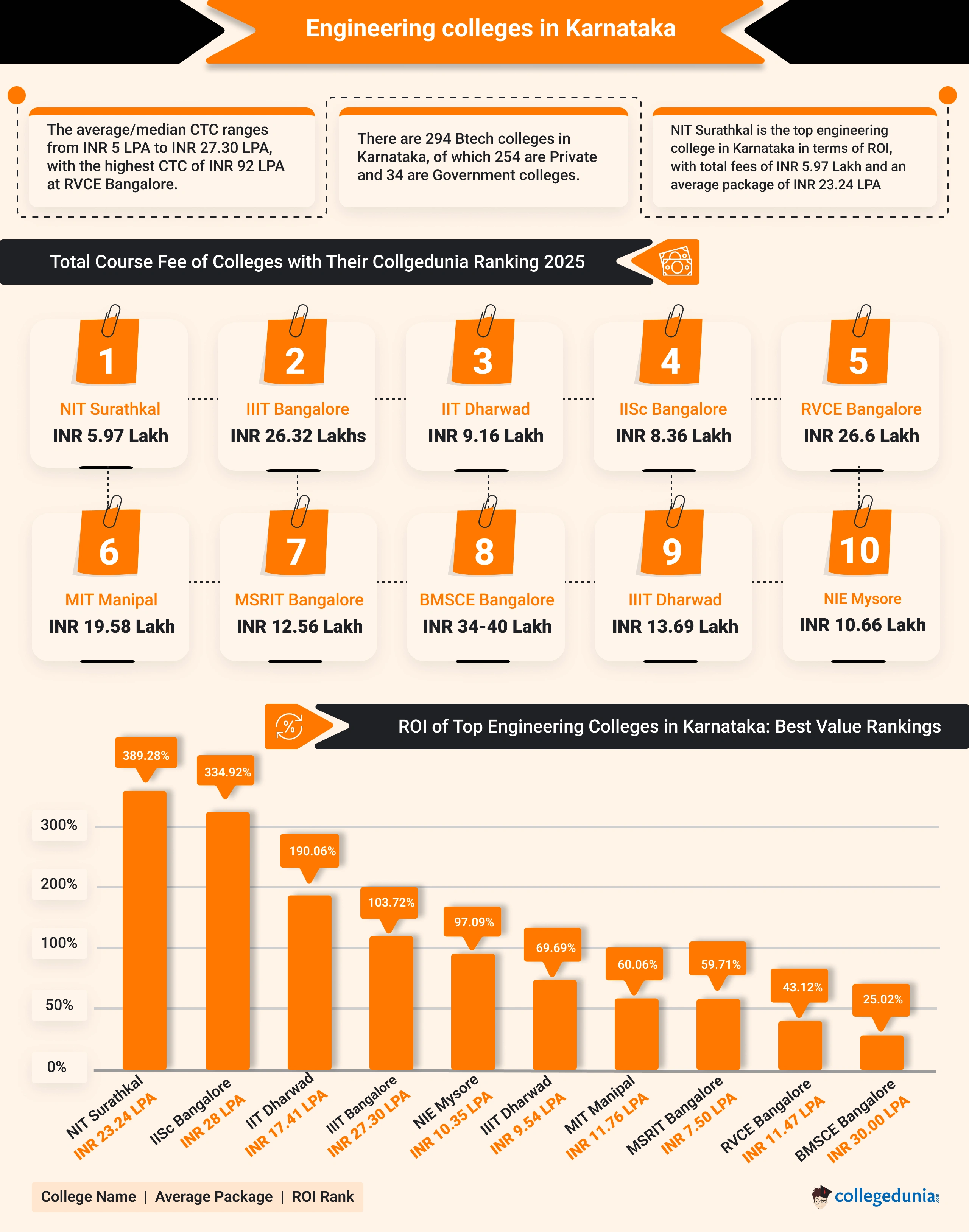 The average fees to enrol in government BTech colleges are between INR 4 Lakh and INR 13.69 Lakhs, while the fees to enrol in private engineering colleges are between INR 10.66 Lakhs and INR 40 Lakh. For BTech, the average package is INR 4.50 to INR 27.30 LPA. RVCE Bangalore has recorded the highest placement package of INR 92 LPA. NIT Surathkal is the top engineering college in Karnataka in terms of ROI, with total fees of INR 5.97 Lakhs and an average package of INR 23.24 LPA. According to the latest NIRF 2025 report, NIT Karnataka is the top institute in Karnataka, ranking 17th in India. It is followed by MIT Manipal with a rank of 59th In India.