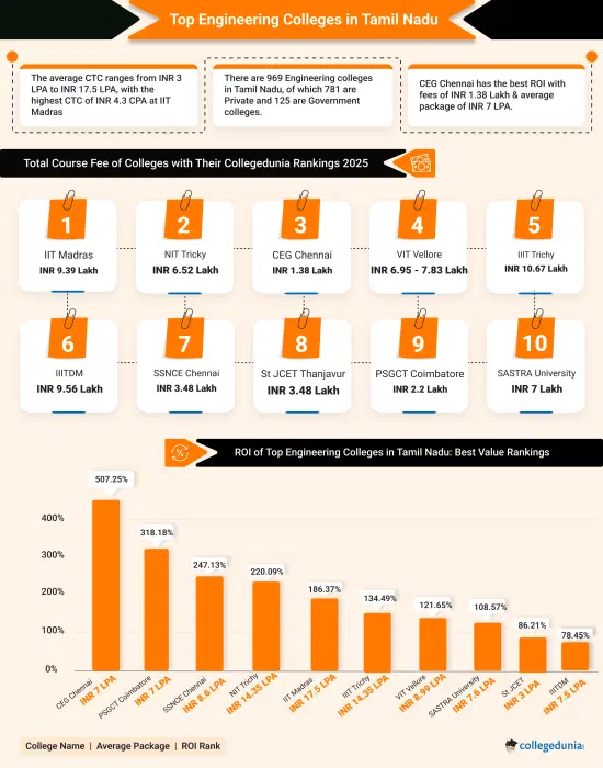 ROI: IIT Madras and NIT Trichy offer very high ROI, with CEG Chennai leading at an impressive 507%. This indicates excellent value for investment in education.