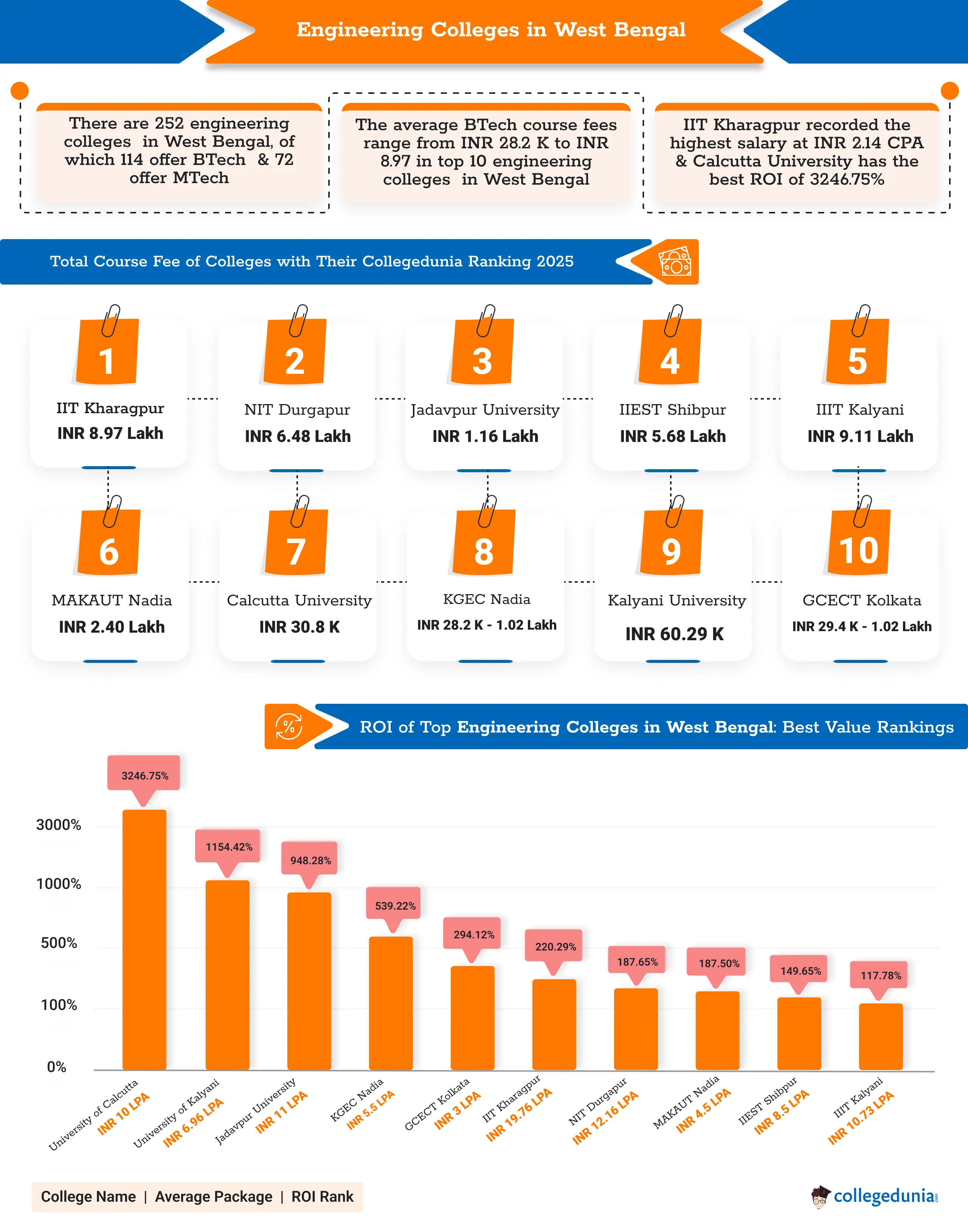 The average fees for enrolling in government BTech colleges range from INR 28.2 K to INR 8.97 Lakh, while the fees for enrolling in a private engineering college range between INR 3.65 Lakh to INR 25.01 Lakh. The average package ranges from INR 3.20 LPA to INR 19.76 LPA for BTech. IIT Kharagpur recorded the highest package at INR 2.14 CPA. The University of Calcutta is the top BTech college in West Bengal in terms of ROI. The total ROI offered is 3246.75% and the highest & average packages of the college are INR 12 LPA & INR 10 LPA. According to the NIRF 2025 Engineering rankings, IIT Kharagpur secured the 5th position, followed by Jadavpur University in 18th place. NIT Durgapur ranked 49th, while IIEST Shibpur was placed at the 54th position.