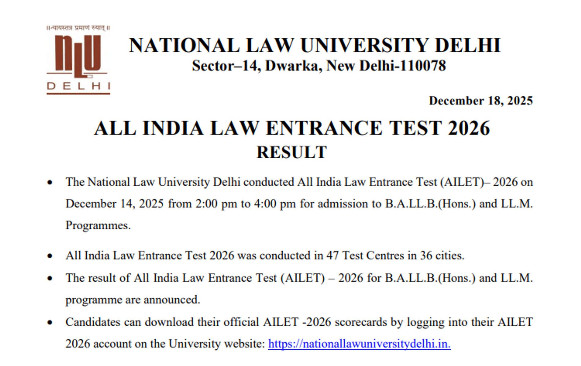 The All India National Law University, Delhi, has announced the AILET 2026 results on 18th December 2025. You can download your official AILET 2026 scorecards by logging in to your AILET 2026 account on the university’s official website, nationallawuniversitydelhi.in.