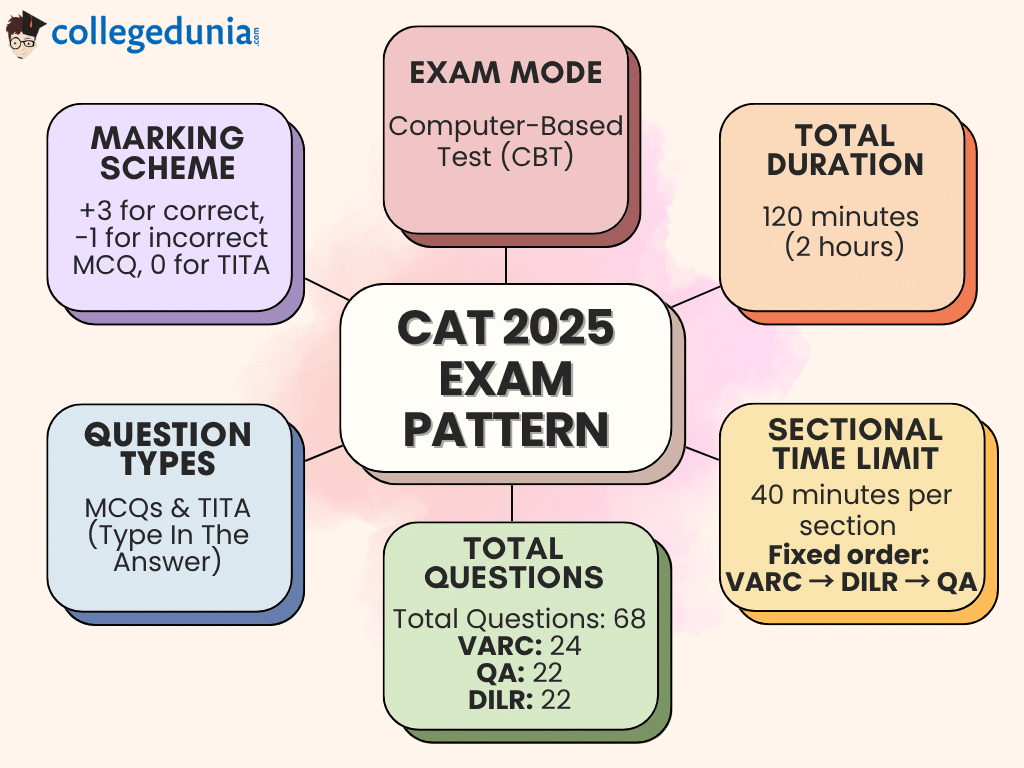 The CAT Exam Pattern 2025 has been officially released by IIM Kozhikode, and there are few changes in the paper structure in CAT 2025. The CAT 2025 will be held on 30 November 2025 as a computer based test (CBT) in a single shift .