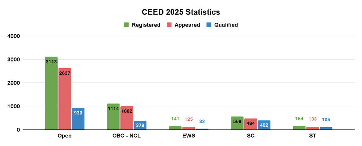 CEED exam is held once a year for M.Des and PhD admissions at IITs, IISc & select institutes. Last year CEED statistics show that 5090 students registered, 4371 appeared and 1848 students qualified.
