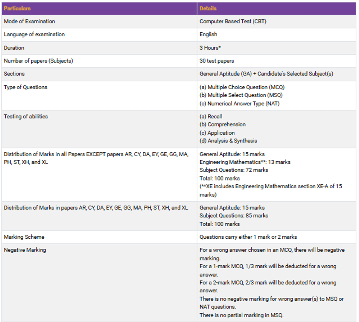 Ans. There are 65 questions, each worth 100 marks. It shall be conducted in Computer-Based Test (CBT) mode and 30 subjects. The paper consists of General Aptitude (15 marks) and subject-specific sections, which are different with the presence or absence of Engineering Mathematics.