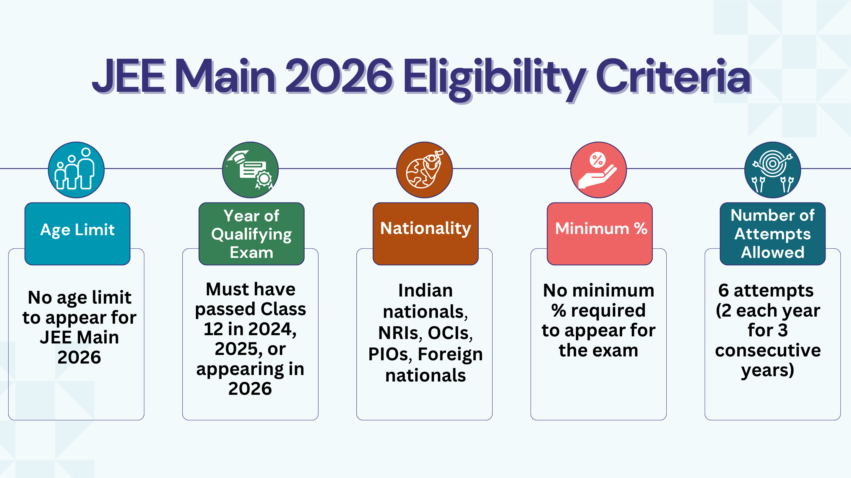 According to the JEE Main 2026 Eligibility criteria, there will be no age restriction, and all applicants, including repeaters, gap-year students, etc., can apply, provided they cleared Class 12 in 2024, 2025, or are appearing in 2026.