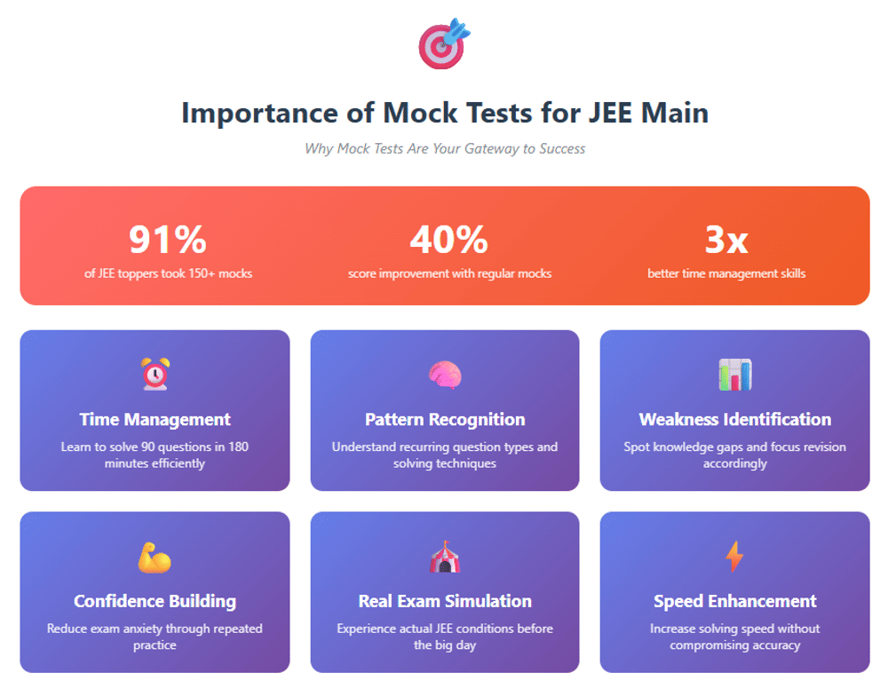 Mock tests are an IMPORTANT part of JEE Main preparation. They help you get familiar with the actual exam pattern and improve your speed. Regular practice trains your mind to solve questions quickly and accurately. You also learn how to manage time during the exam. Mock tests show you where you are making mistakes. This helps you focus on weak topics and improve them.