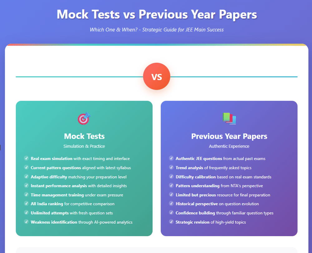 The best way is to use both. Solve previous papers to know the exam style. Take mock tests to build confidence and perform better under time pressure. This will help you prepare in a complete way.Let’s compare both comprehensively: