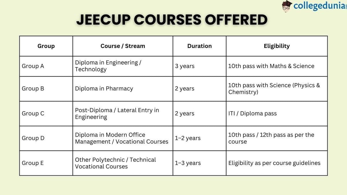 Ans. The JEECUP Eligibility will differ as per different groups, but is mainly based on the educational qualification and age of the candidate.