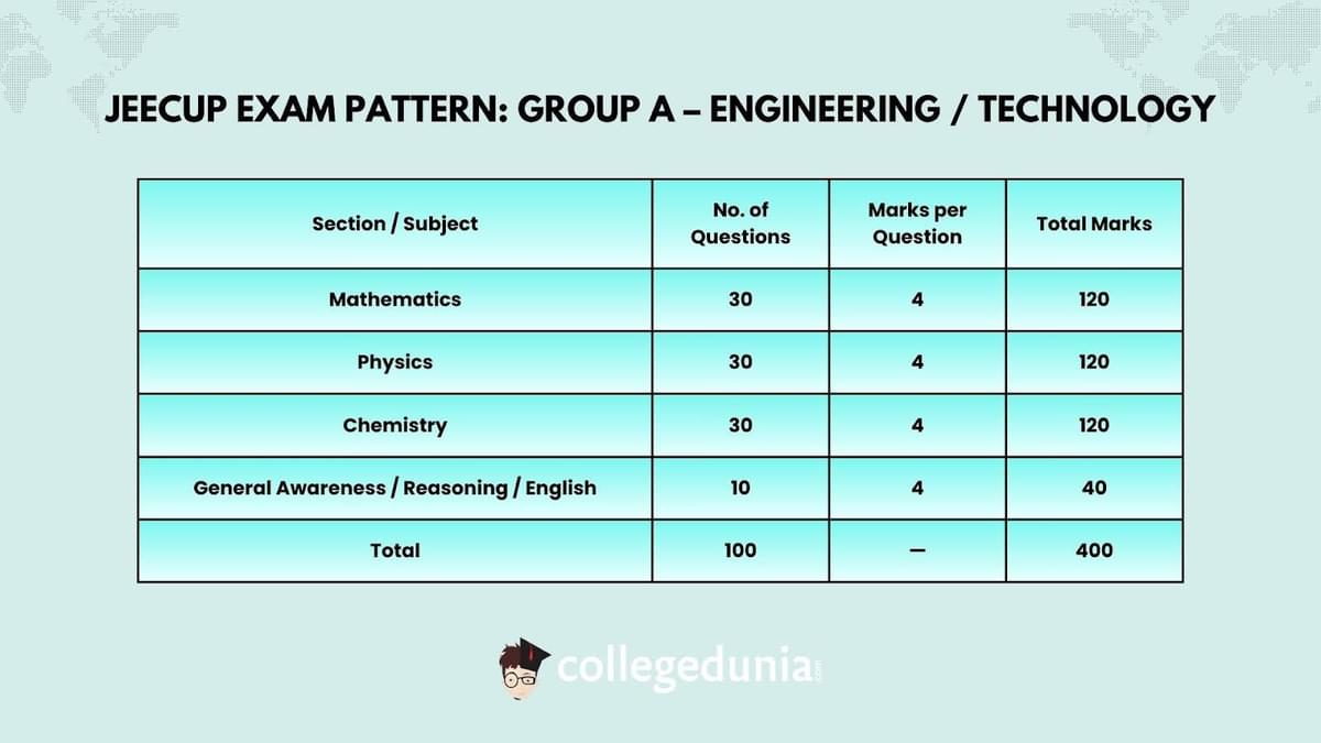 - The JEECUP engineering group will include Mathematics, Physics, and Chemistry, whereas other groups will have English, Reasoning & General Awareness.