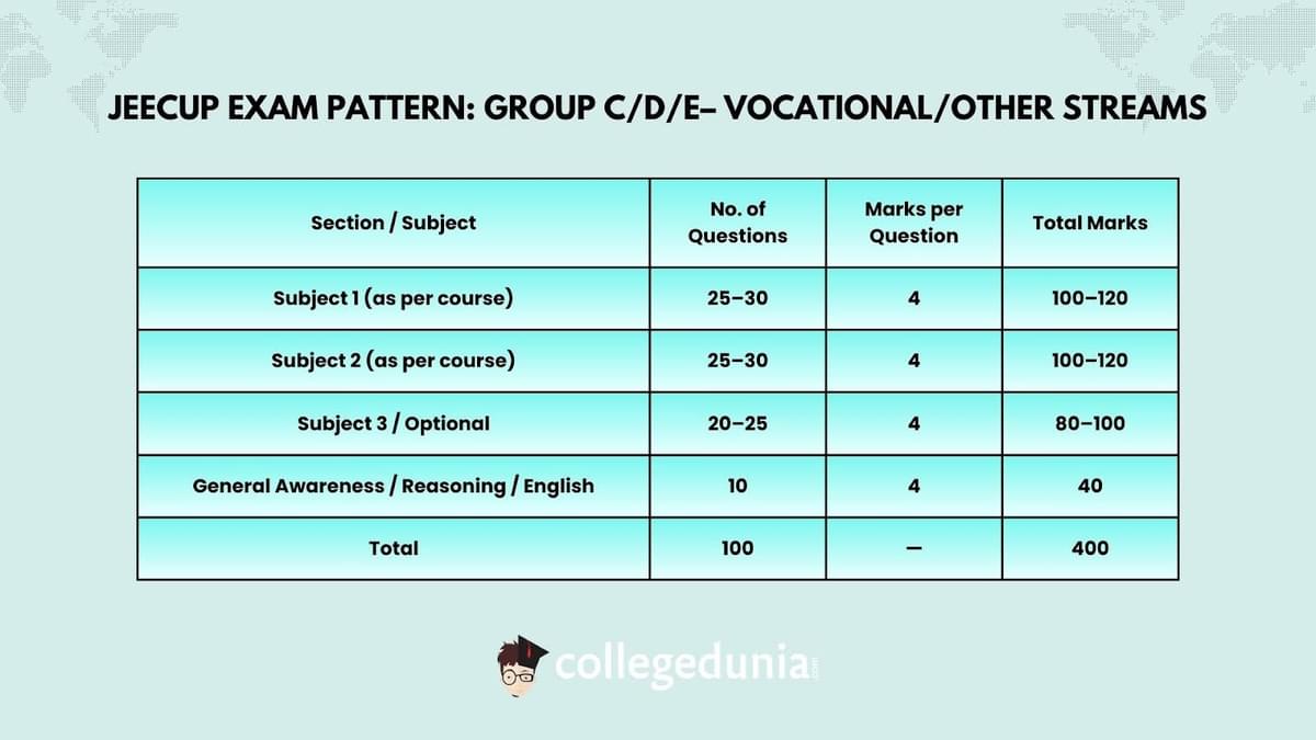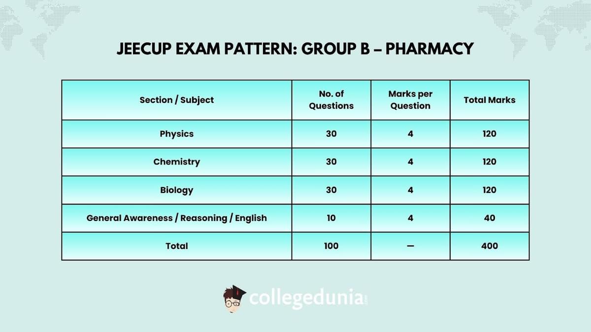 Ans. The JEECUP Exam pattern will differ according to different groups, but the structure is the same.