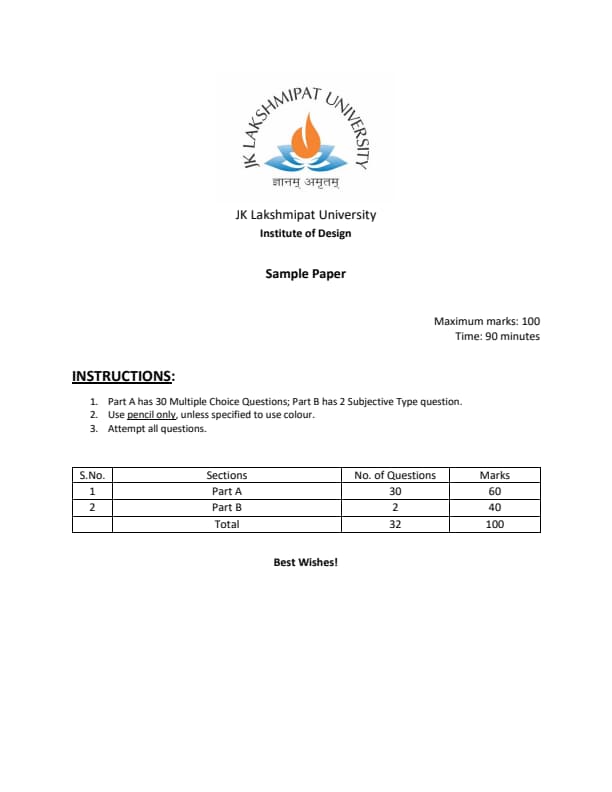 As per JKLU DET 2024 Exam Pattern, the question paper will consists of 32 questions i.e., 30 MCQs and 2 Subjective questions of total 100 marks. Candidates will be given 90 minutes to solve the question paper. The entrance exam will have two sections: