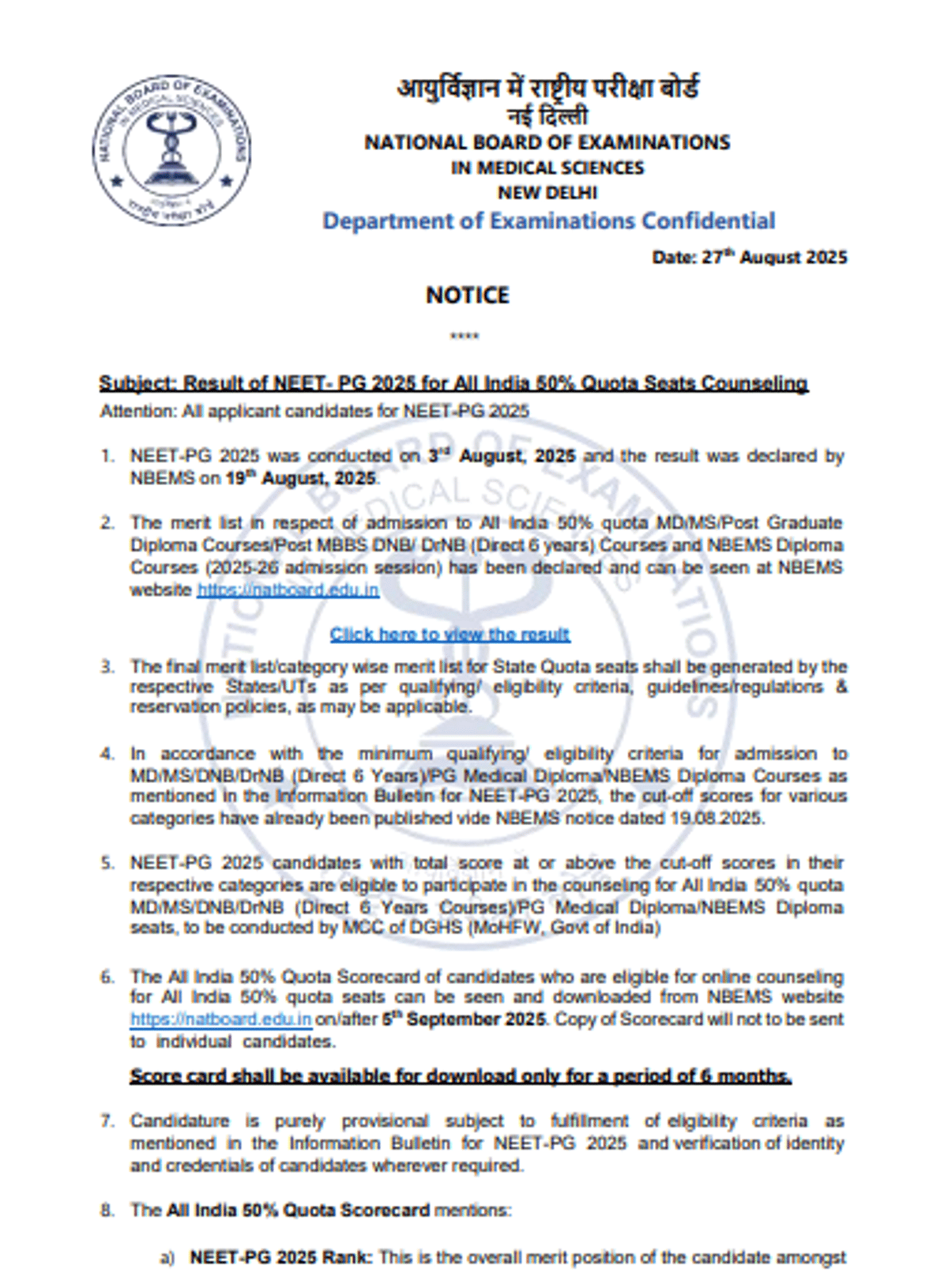 The NBEMS has released the NEET PG Merit list result for 50% AIQ seats on 27th August 2025.