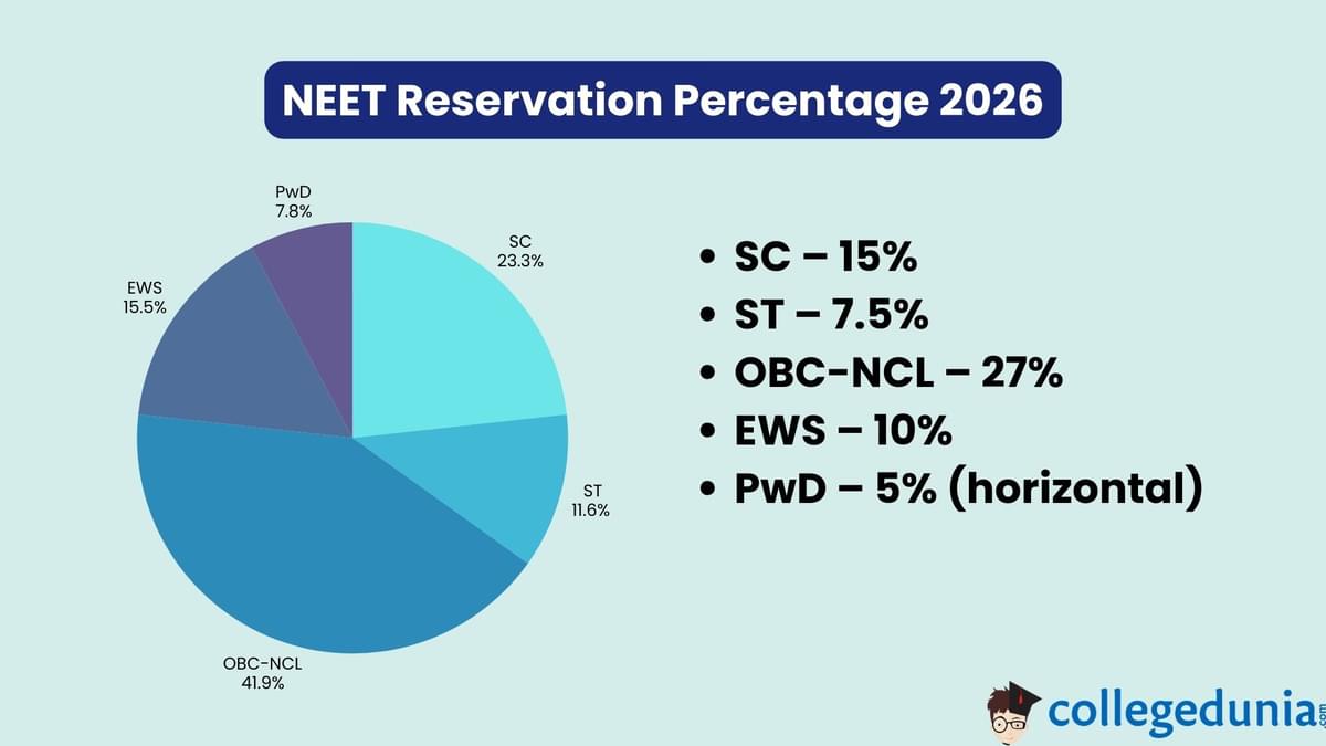 The NEET Reservation Criteria 2026 will be the same as last year 15% for SC, 7.5% for ST, 27% for OBC-NCL, 10% for EWS, and 5% horizontal for PwD.