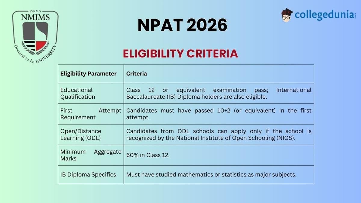 - Admission to NMIMS UG programs is based exclusively on NPAT or other institute-specific entrance criteria.