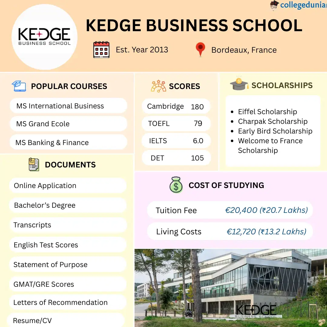 KEDGE Business School offers 9 business programs to international students. These include 8 Master’s programs and 1 Bachelor’s program. The most popular courses among Indian students are the MS International Business, MIM Grand Ecole, MS Marketing, and MS Global Supply Chain Management. The estimated annual tuition fees for these programs are in the range of €16,100 - €20,400 (₹16.4 - 20.7 Lakhs). The annual tuition fee for the BBA program is €10,750 (₹10.9 Lakhs). KEDGE B-School also offers several scholarships for international students, including the Early Bird Scholarship (up to 10% off tuition fees) and the Eiffel Scholarship (which covers tuition and provides additional support). Scholarships are awarded based on merit and application date.