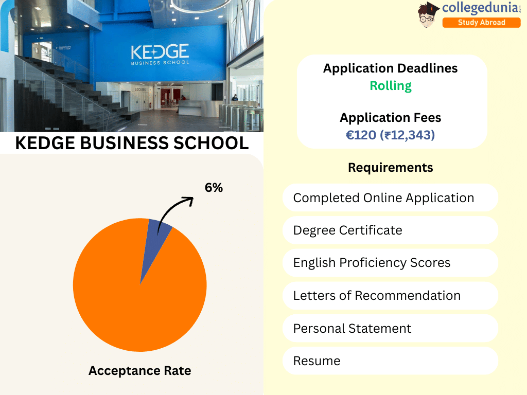 KEDGE Business School has an acceptance rate of just 6%, which makes the admission process highly competitive. Yet the admission requirements of the KEDGE B-school are simple. You are not required to take any standardized tests like GMAT or GRE, or have any minimum academic scores. However, you are still advised to submit these scores, as they can help improve your application.