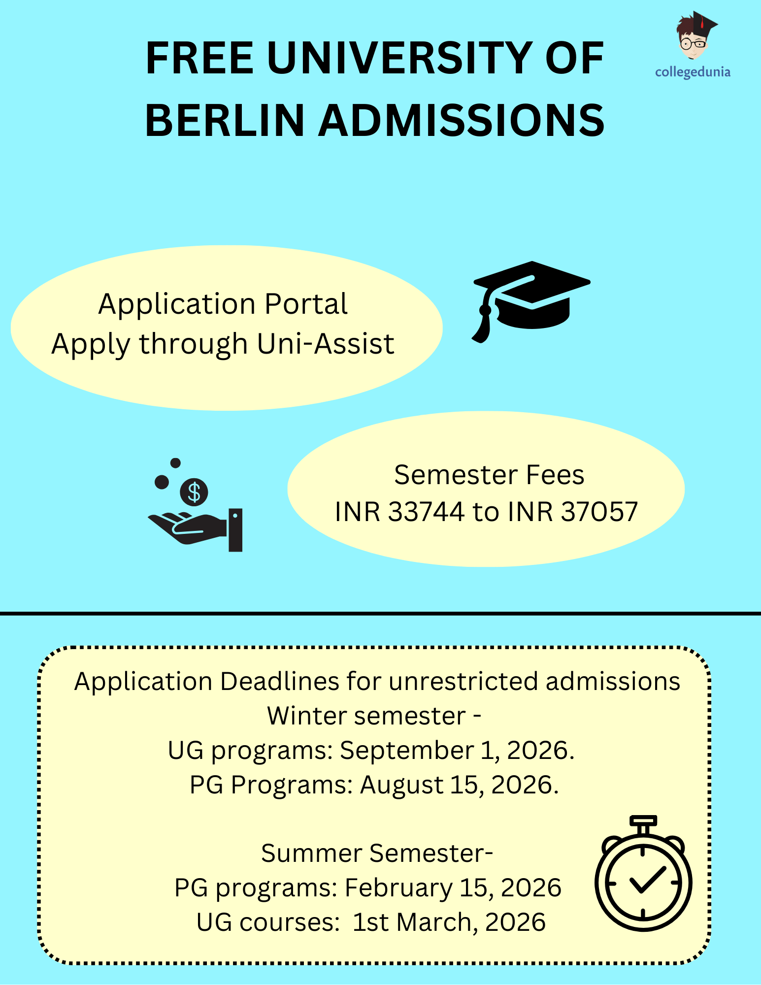 Free University of Berlin accepts applications via Uni-assist for both UG and PG Admissions. The Uni-Assist charges an application fee of 75 EUR (INR 7773) for the first application and 30 EUR (INR 3109) for each additional application.