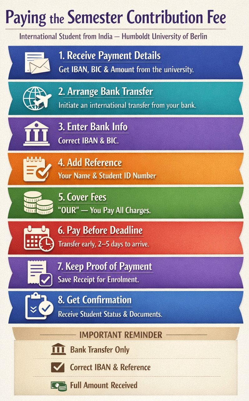 At Humboldt University of Berlin, the semester contribution fee is paid exclusively via bank transfer to the university’s designated bank account.