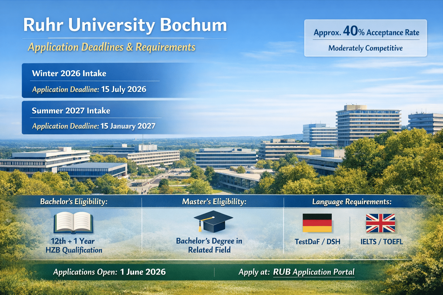Admission Scenario: Currently, admission to master's and bachelor's programs for international applicants is closed. Application for the Winter 2026 intake will reopen on 1 June 2026 (Bachelor's and Master's programs). Students can use the link mentioned below in the article to apply for admission to RUB.
