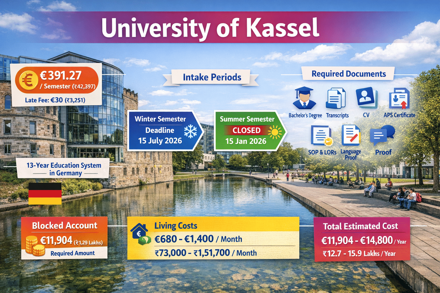 The University of Kassel offers two main intakes for international students: the Winter semester and the Summer semester. The Winter intake is the primary intake with a wider range of courses, while the Summer intake has limited program availability. Students are advised to apply early through uni-assist, as deadlines are strict and processing times (including APS and visa) can take several weeks.