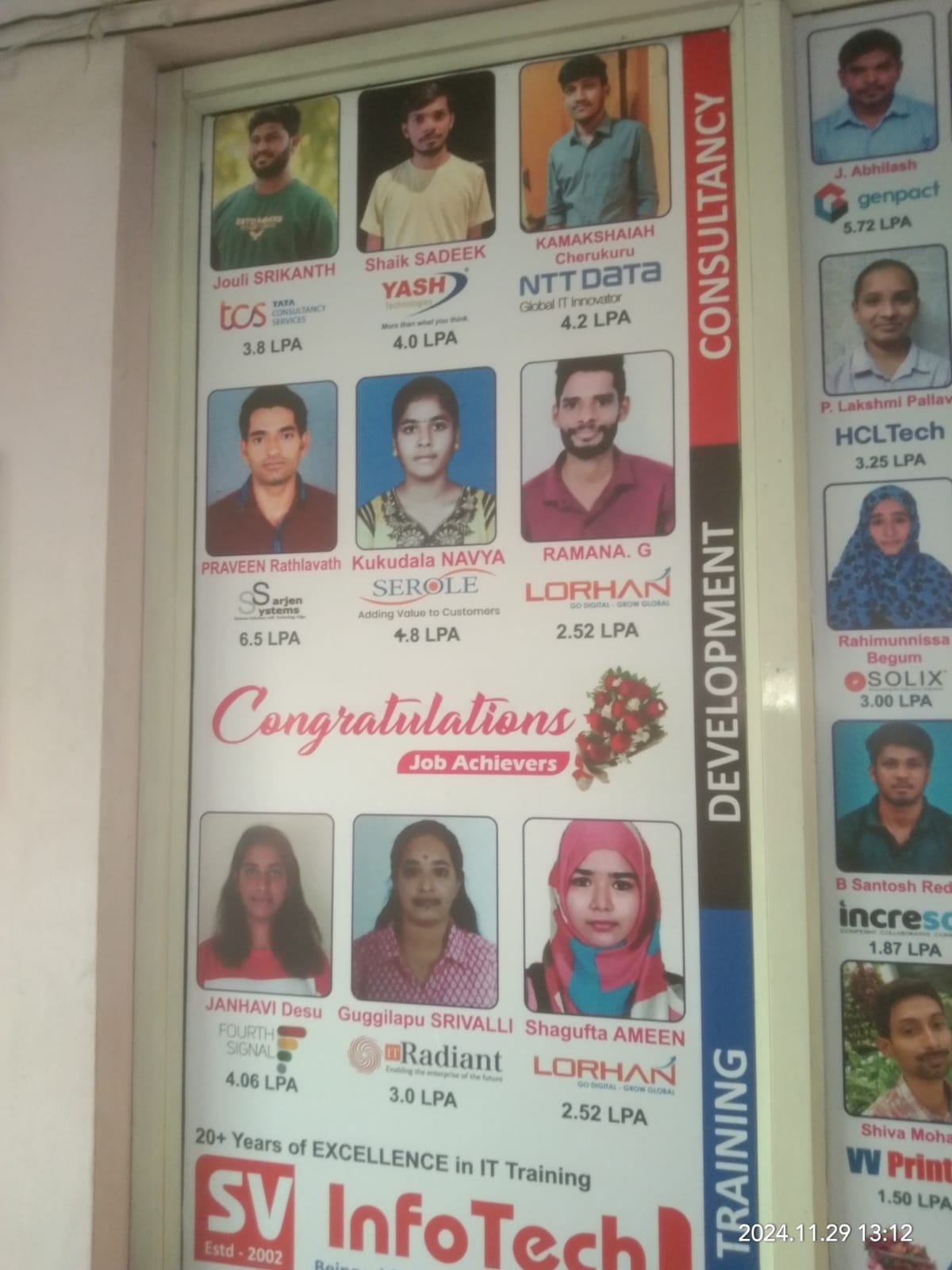SV InfoTech was established in 2002, Maruthi Komuravelli & Kamalakara Raju Byrraju are the directors of the institute and it is located in Dilsukhnagar, Hyderabad provides Data science, AI, Programming Languages, Fullstack web development, Testing, SAP and more coaching institutes in Hyderabad. The institute is known for its experienced faculty, Academic project with real time implementations, and 5 - 10 students per batch.