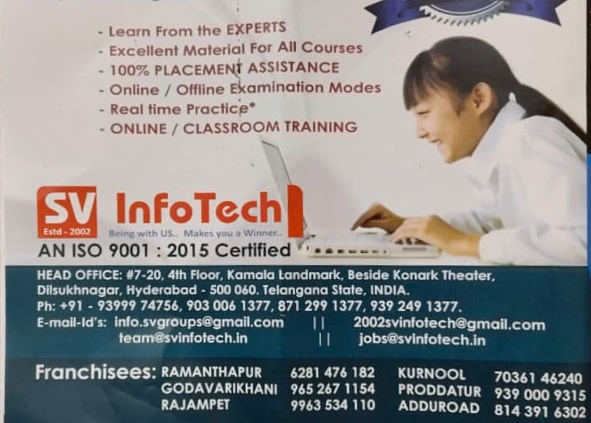 SV InfoTech (Head Office cum Training Division) | 7-20, 4th Floor, Beside Konark Theater,Dilsukhnagar, Hyderabad, Telangana, India – 500060 | 093999 74756 090300 61377 |