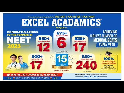 Excel Acadamics Bangalore offers students of class 11-12 with online and offline mode of classes. Students can choose according to their preference and convenience. The average fees of these courses vary around Rs. 1,00,000. Students can get up to 100% scholarship. Excel Acadamics has a remarkable track record of producing excellent results. This year 6 students have scored above 675 marks while 12 and 17 students have scored above 650 and 600 respectively. Overall, 292 students scored above 550 marks in NEET 2023.