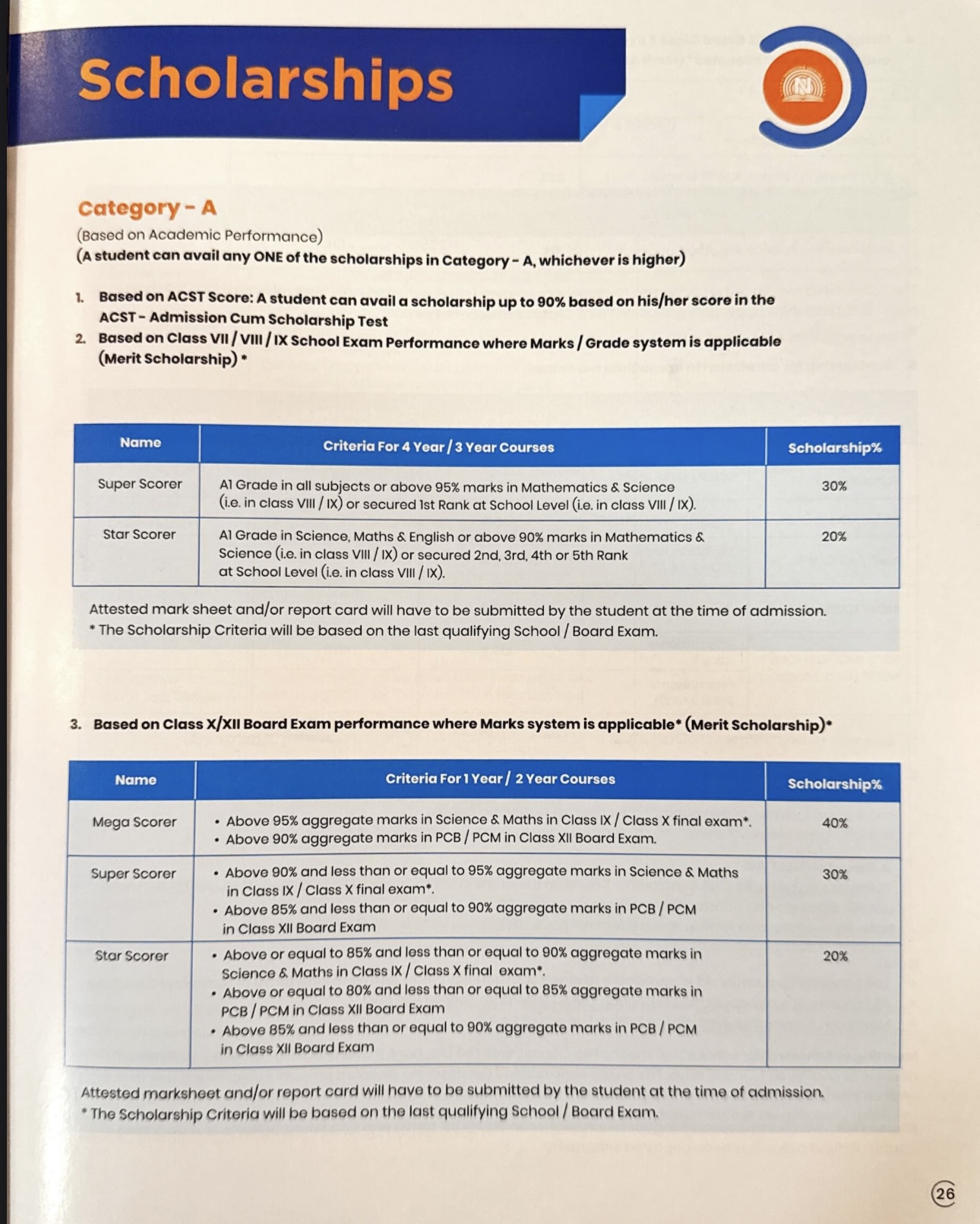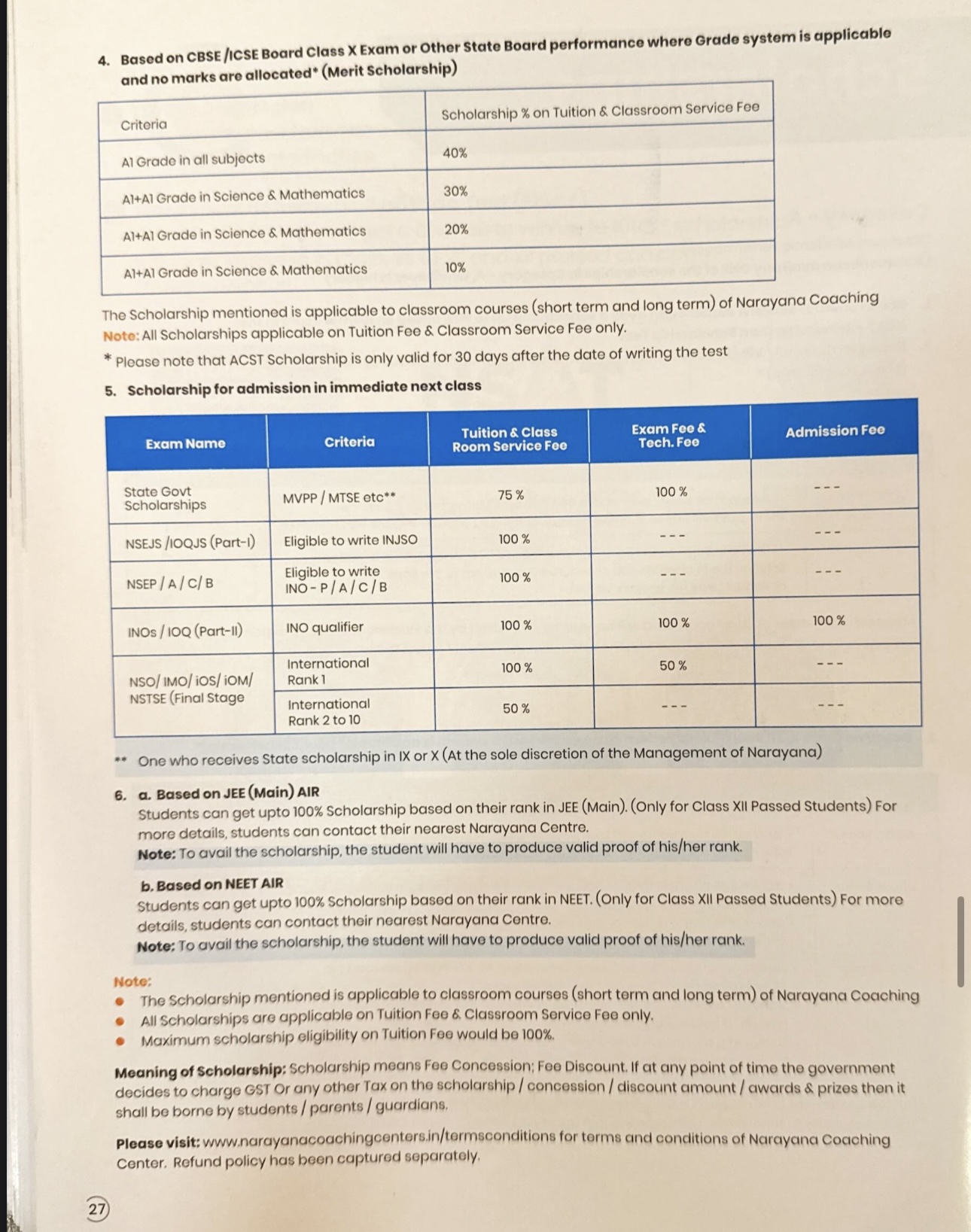Narayana offers its students the opportunity to excel in their competitive exam preparation with scholarships on tuition fees. Scholarships are considered on the basis of their performance in N-ACST (Narayana Admission cum Scholarship Test) or NSAT (Narayana Scholastic Aptitude Test). With up to 90% scholarship, Students can enjoy the benefits of studying under the guidance of Narayana. The data below explains all the benefits and amounts awarded to students by Narayana