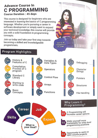 Introduction to C Programming, Basic C Syntax and Structure, Control Structure, Functions and Modular Programming, Arrays and Pointers, File I/O, Structures and Unions, Dynamic Memory Allocation, C Preprocessor and Macros, Error Handling and Debugging, Real-world Projects, Porfolio Development |