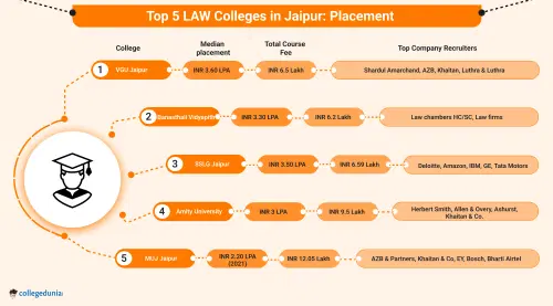 MUJ Jaipur | INR 2.20 LPA (2021) | INR 12.05 Lakh | 18.26% | AZB & Partners, Khaitan & Co, EY, Bosch, Bharti Airtel |
