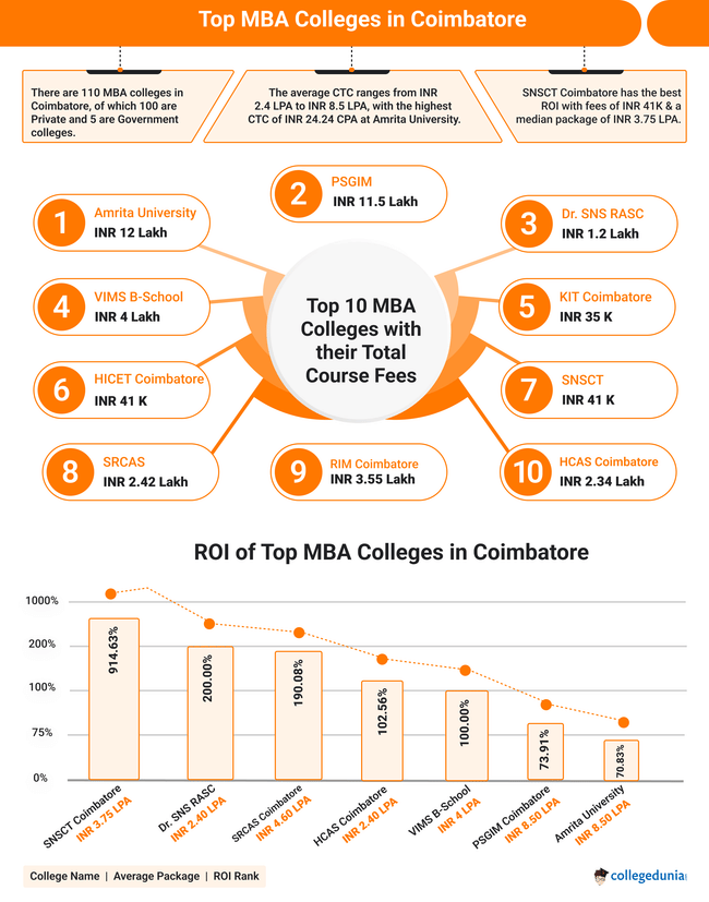 Coimbatore has 111 MBA colleges, out of which 110 are private and 10 are government. We have provided an overview of the number of MBA colleges in Coimbatore in this table.
