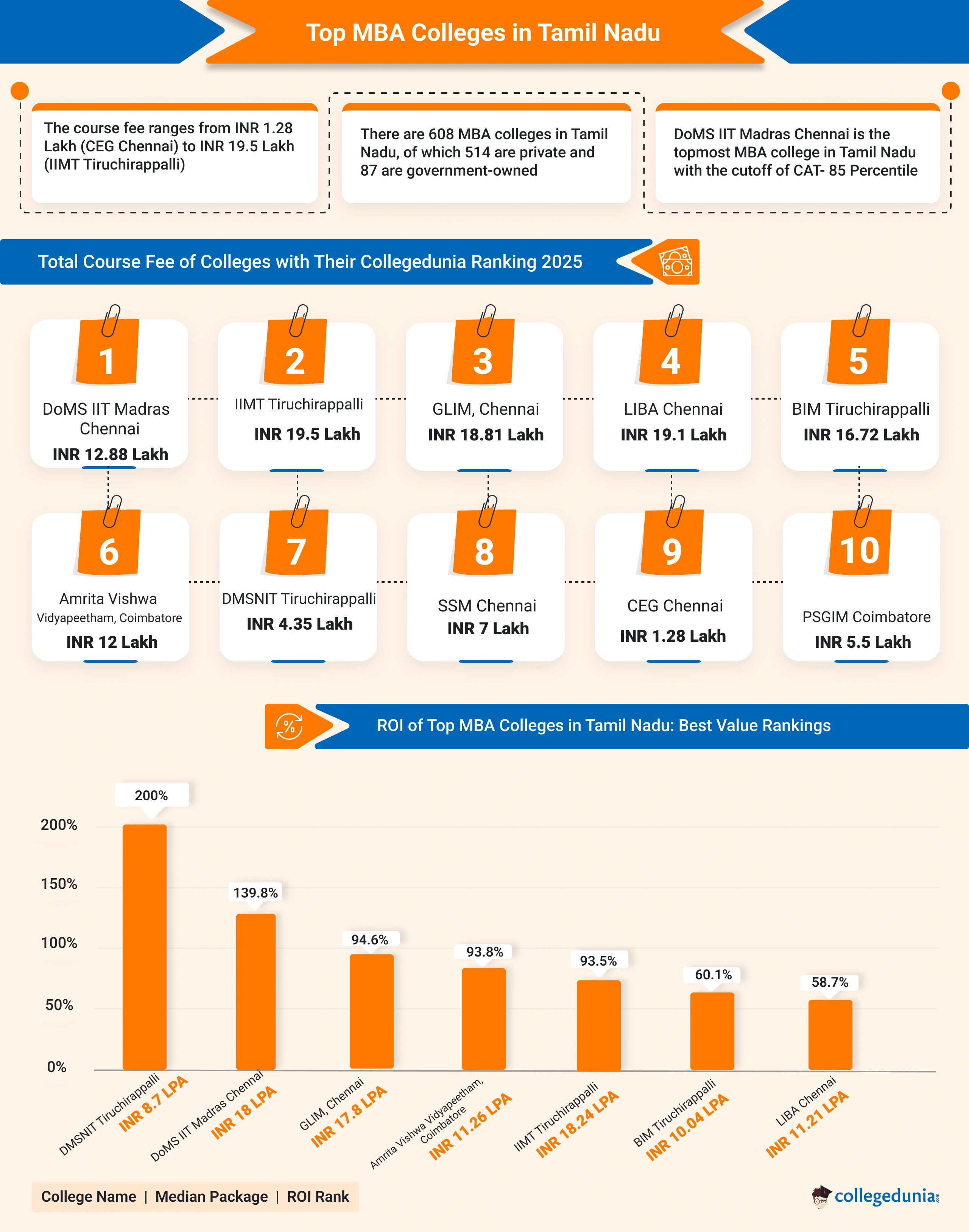 - The total fee for MBA colleges in Tamil Nadu ranges from INR 1.28 Lakh (CEG Chennai) to INR 19.5 Lakh (IIM Trichy).