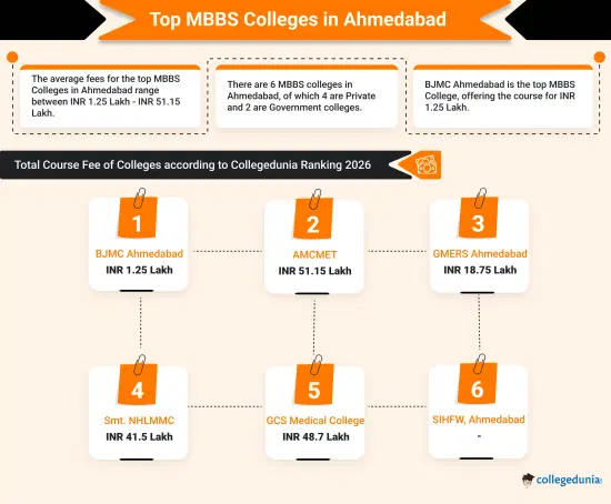 - Fees: MBBS Course fees at the top MBBS Colleges in Ahmedabad range from INR 1.25 Lakh at BJMC Ahmedabad to INR 51.15 Lakh at NMMC Ahmedabad, and at Private colleges, fees range from INR 18.75 Lakh at GMERS Medical College and Hospital to INR 48.7 Lakh at GCS Medical College.